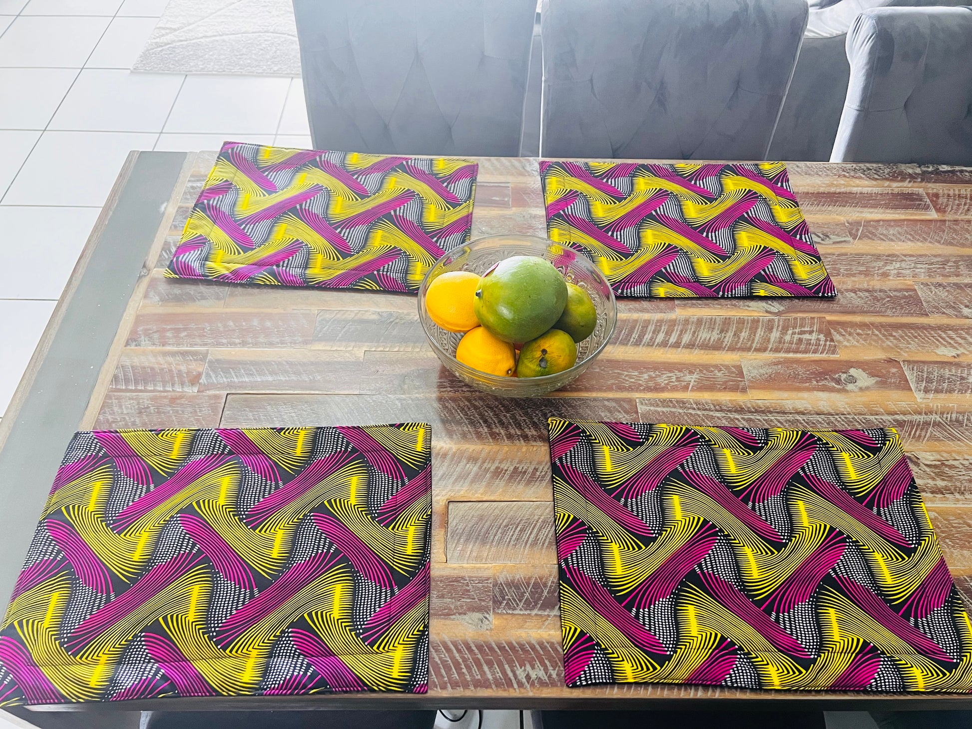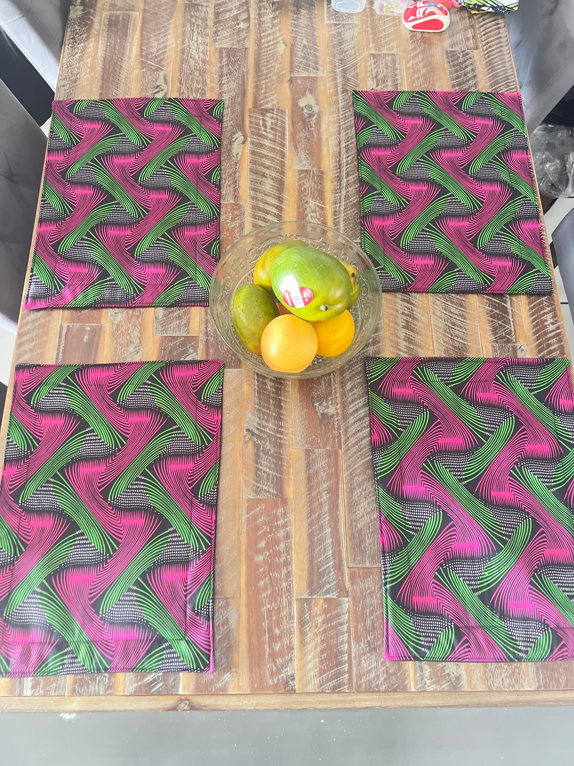 The perfect addition to your dinner table. Host your loved ones with these beautifully handmade placemats, padded with heat-resistant wadding for extra protection for your table. The Ankara fabrics are carefully curated to provide a bold and unique table setting that will set you apart from the average host. Get these for yourself or as a souvenir for friends and family.
